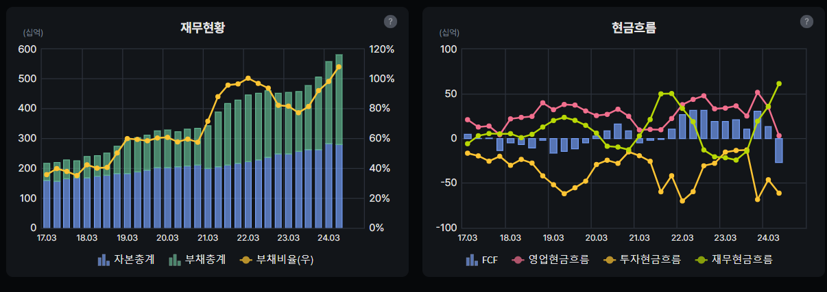 대원제약의 재무현황을 보면 최근 들어 부채비율이 100%를 넘긴 모습을 볼 수 있습니다. 또한 현금흐름을 보면 영업현금흐름이 2024년 3월에 급격하게 꺾인 모습을 보입니다. 이는 회사에 돈이 실제로 들어오는 돈이 적어졌음을 의미합니다.