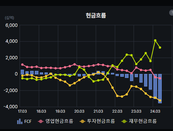 한화솔루션의 현금흐름을 살펴보면 FCF는 계속해서 적자를 기록하는 모습을 보이고 있습니다. 영업현금흐름이 24년 들어 4분기 합산 적자로 들어선 점도 눈에 띕니다. 한화솔루션은 2022년부터 급격한 투자를 진행하고 있으며 현재까지도 투자금이 많은 모습을 볼 수 있습니다.