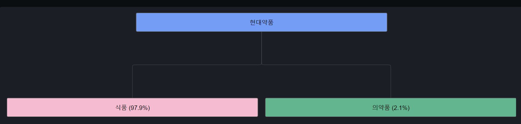 현대약품의 사업구조를 보면 식품에서 매출의 98%를 얻고 있으며 의약품으로 2%의 매출을 올리고 있습니다.