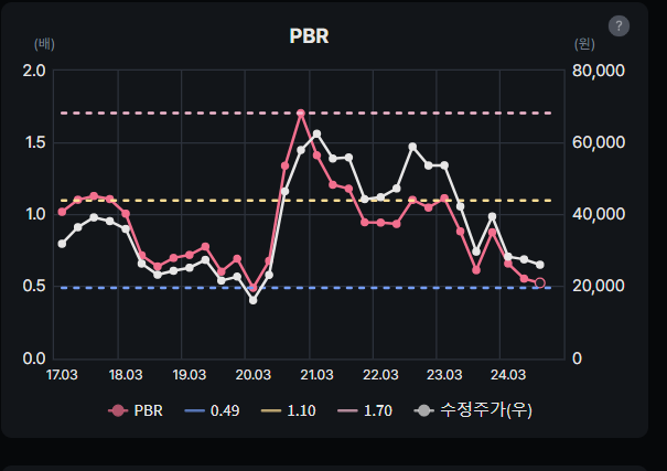 한화 술루션의 PBR을 살펴보면 2020년 말 코로나로 인해 유동성이 풀리고 신재생 에너지가 각광받던 시기에 PBR 1.7배까지 올라간 모습을 보였습니다. 이후에는 투자금액이 많아져서 순자산이 높아지며 PBR이 낮게 형성되는 모습을 보입니다. 주가도 6만 원 부근까지 갔던 주가가 최근에는 2만 원 대에서 거래되고 있는 모습입니다.