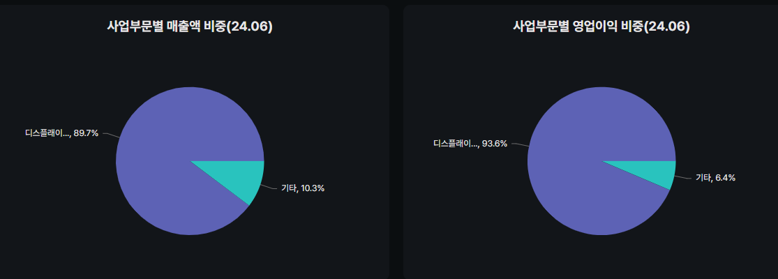 오성첨단소재의 주 매출액은 디스플레이 소재부문입니다. 디스플레이 소재부문에서 90%에 가까운 매출액을 올리고 있으며 영업이익도 마찬가지로 93%에 가깝습니다.