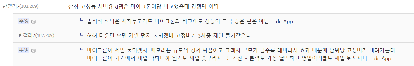 1. 삼성 고성능 서버용 디램은 마이크론과 비교했을 경쟁력과 성능이 떨어지는 편임.