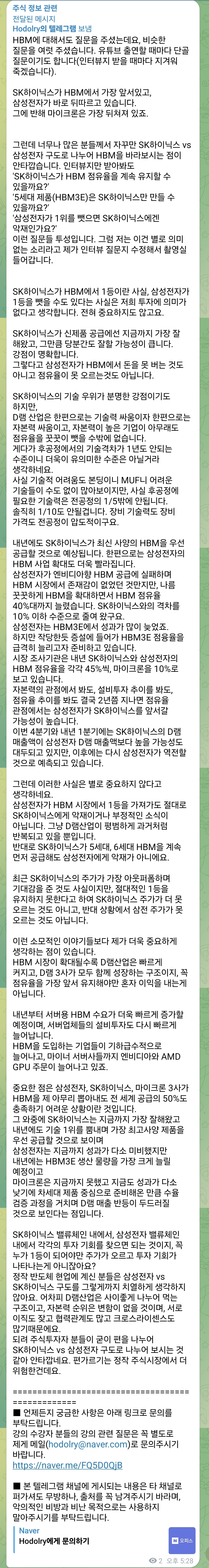 호돌이님 HBM 관련 언급 탤레그램 본문