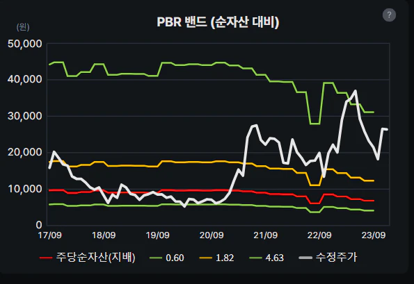 선익시스템의 PBR 밴드 표를 보시면 두 가지가 눈에 띕니다. 첫 번째는 PBR 밴드 선이 우상향 하는 것이 아닌 거의 비슷하게 일직선을 그리고 있다가 최근 들어 점점 우하향 한다는 점입니다. 주당순자산이 늘어나지 않는다는 것은 선익시스템 자체적으로 증설을 하지 않는다는 의미이며 우하향 한다는 것은 주식수가 늘어나거나, 아니면 가지고 있는 순자산을 판다는 의미이므로 관련 내용을 확인할 필요가 있습니다.