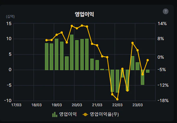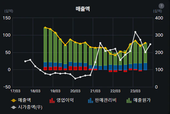 영업이익의 경우에는 상장 후 분기별 100억대의 이익을 거두다가 21년 즈음부터는 적자도 기록을 했습니다. 디스플레이 산업이 다운사이클을 겪었고 삼성디스플레이나 LG디스플레이, BOE가 대규모 증설을 하지 않았기 때문입니다. 하지만 디스플레이 산업은 우리가 모니터, 티비, 핸드폰, XR 기기 등 전자기기를 사용하는 한 절대 없어지지 않을 산업이므로 현재의 다운 사이클이 추후에는 업싸이클로 바뀔 수 있음을 기억해야 합니다.