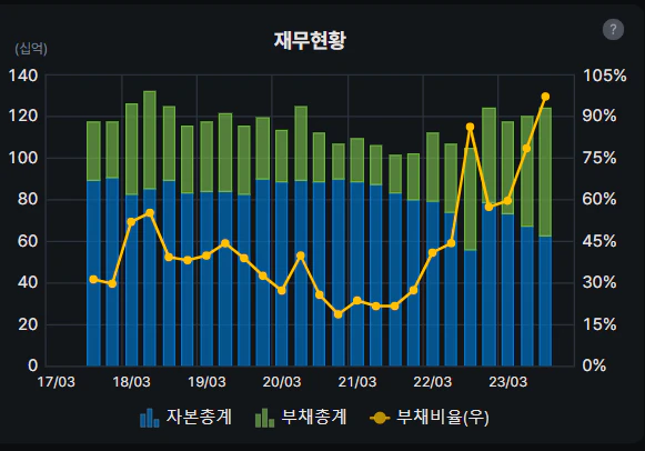 선익시스템의 재무현황을 살펴보겠습니다. 우선 가장 눈에 띄는 점은 최근 부채비율이 가파르게 올라가고 있다는 점입니다. 22년 전까지만 해도 최고 수준의 부채비율이 60%였지만 최근에는 거의 100% 부채비율까지 도달했네요. 물론 부채비율이 100%라고 무조건 위험하다고 볼 수는 없지만 어쨌든 과거에 비해 자본의 양보다 부채의 양이 많아지는 것이니 해당 사항에 대해 주의할 필요는 있습니다.