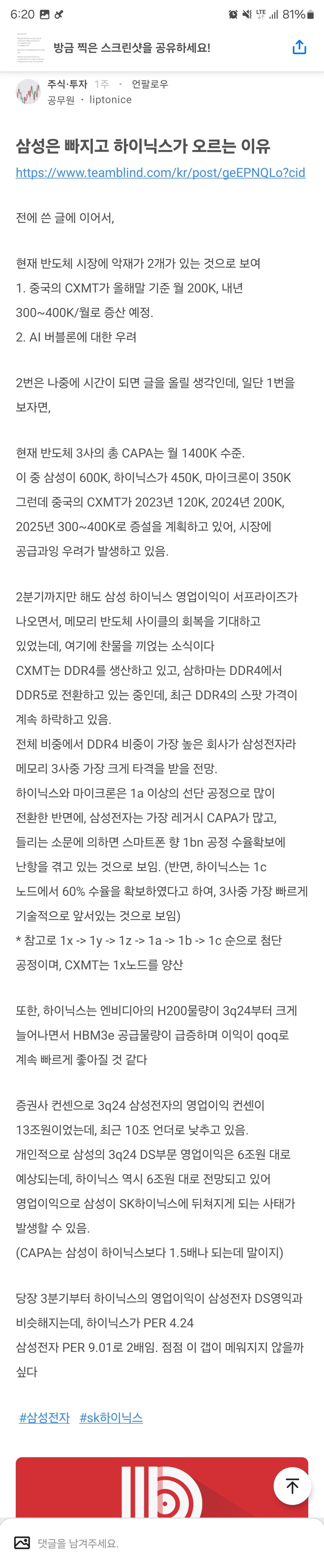 2024년 8월부터 삼성전자 주가가 안 좋은 이유는 CXMT와 경쟁하는 레거시 물량인 DDR4 비중이 디램 3사 중 가장 높기 때문입니다. 디램 기술력에서 가장 앞서고 있는 하이닉스는 1c노드의 수율이 60프로 정도라고 알려져 있습니다. 반면 삼성전자는 1a, b, c 노드를 동시에 개발하며 1b, 1c 디램이 공통적으로 수율이 안 나오는 문제가 있다고 알려져 있으며 현재 디램 산업은 과거 삼성의 독주 체제에서 하이닉스의 독주 체제로 변화 중이라고 개인적으로 생각합니다. 변화는 곧 기회이자 위기로 볼 수 있으며 과거 싸게 만들어 파는 게 중요했던 디램 산업이 이제는 HBM과 같은 메모리 반도체의 등장으로 품질이 중요한 산업으로 변화하는 중이며 이는 향후에도 AI 산업에서 마찬가지일 것으로 개인적으로 예상합니다.